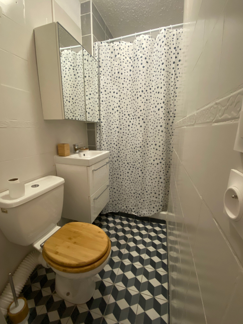 Salle d'eau avec w-c incorporé, sol carrelage.