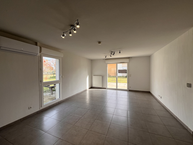 Spacieuse salle de séjour, sol carrelage, éclairée par fenêtre + porte fenêtre ouvrant sur terrasse. Cuisine partiellement équipée et meublée ouverte sur la salle de séjour.