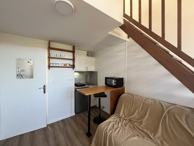 Entrée, sol parquet, avec placard de rangement. Salle de séjour, sol parquet, avec coin cuisine équipée et meublée.